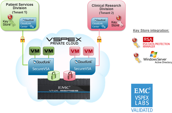 CloudLink provides a natural security extension of EMC’s VSPEX Proven Infrastructure offering flexible data encryption that enables customer to quickly and confidently secure their sensitive data for regulatory compliance, multi-tenant data separation or data destruction needs.CloudLink SecureVSA software defined storage encryption decouples data encryption from the physical storage enabling customers to secure sensitive data without the IT cost and complexity of having to modify their applications or change their underlying infrastructure. The simple-to-deploy solution enables granular encryption on a per-application, per-department or per-operating unit basis providing multi-tenant data separation and key control in an efficient, cost effective manner.